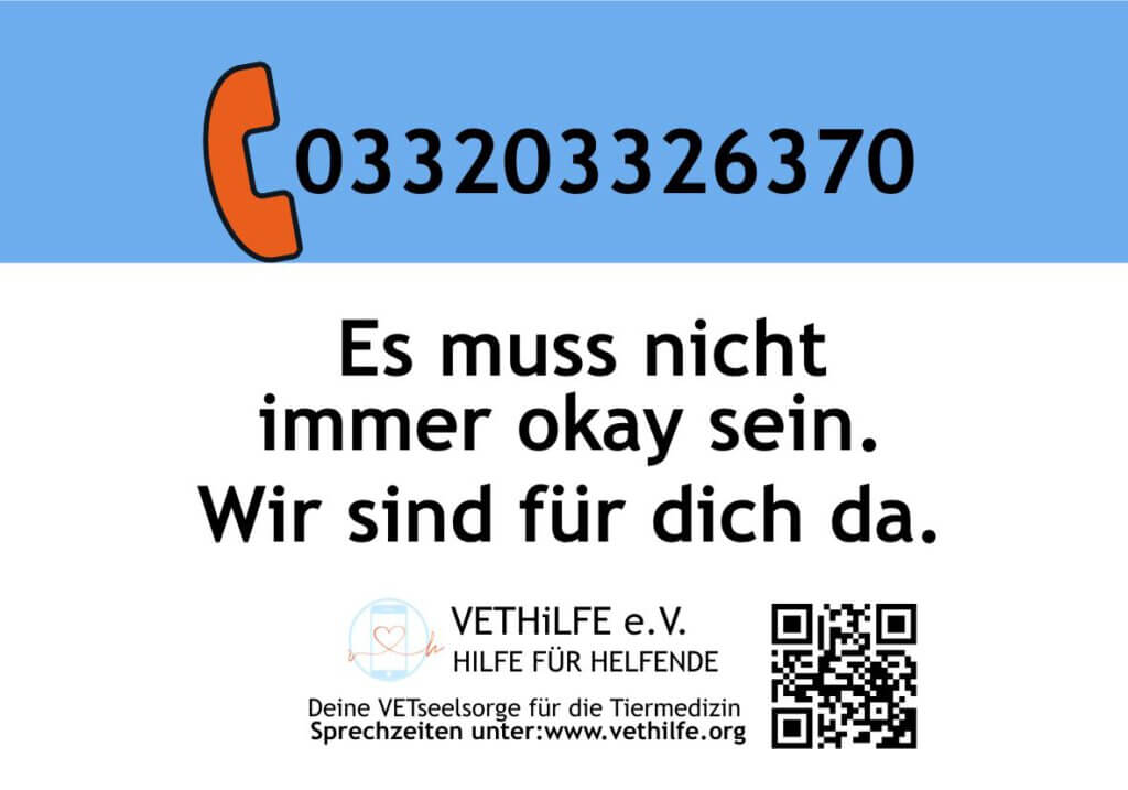 Seit dem 1. Juni 2025 gibt es eine Telefonhotline für tiermedizinisches Fachpersonal. Diese wurde durch den 2024 gegründeten Verein VETHILFE e.V. ins Leben gerufen. Informationen zu den aktuellen Sprechzeiten gibt es auf der Homepage des VETHILFE e.V.