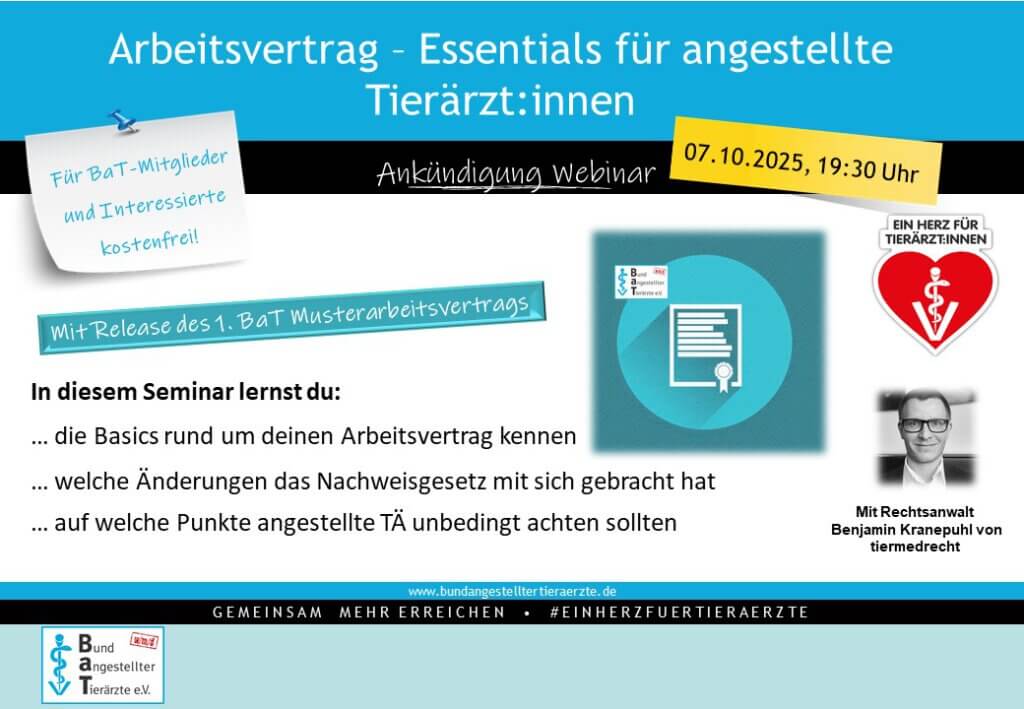 Am 07.10.2025 wenden wir uns im Online-Seminar “Arbeitsvertrag — Essentials für angestellte Tierärzt:innen” den wichtigsten Punkten zu, die es für angestellte Kolleg:innen rund um den Arbeitsvertrag zu beachten gilt.