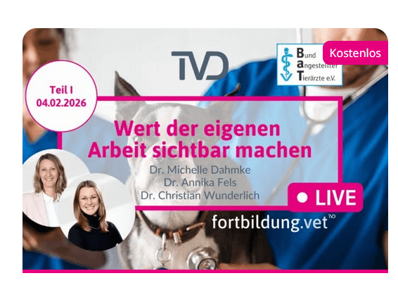 In diesem Live-Webinar am 04.02.2026 um 19:30 Uhr geben Dr. Michelle Dahmke und Dr. Annika Fels von TVD Finanz einen praxisnahen Einblick in die betriebswirtschaftlichen Grundlagen, die für Gehaltsmodelle in der Tiermedizin entscheidend sind. Dr. Christian Wunderlich, 2. Vorsitzender des BaT, ergänzt das Webinar mit wertvollen Einblicken aus der berufspolitischen Praxis und der Interessenvertretung angestellter Tierärzt:innen.