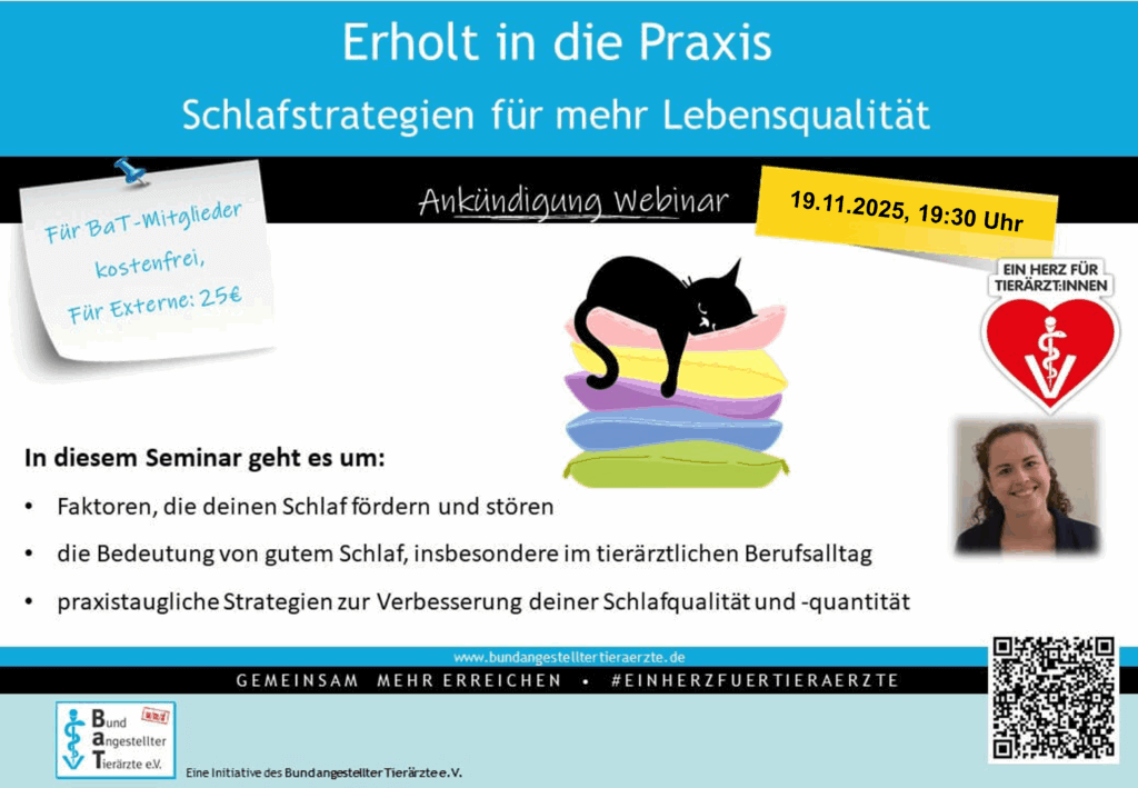 In dem circa einstündigen, interaktiven Webinar wird zunächst auf Grundlagen der Schlafbiologie eingegangen, um im Folgenden konkrete Faktoren, die den Schlaf positiv und negativ beeinflussen, zu besprechen. Insbesondere werden Bedingungen aus dem tierärztlichen Praxisalltag wie unregelmäßige Arbeitszeiten, Schicht-/Nachtdienst und emotionale Herausforderungen thematisiert.