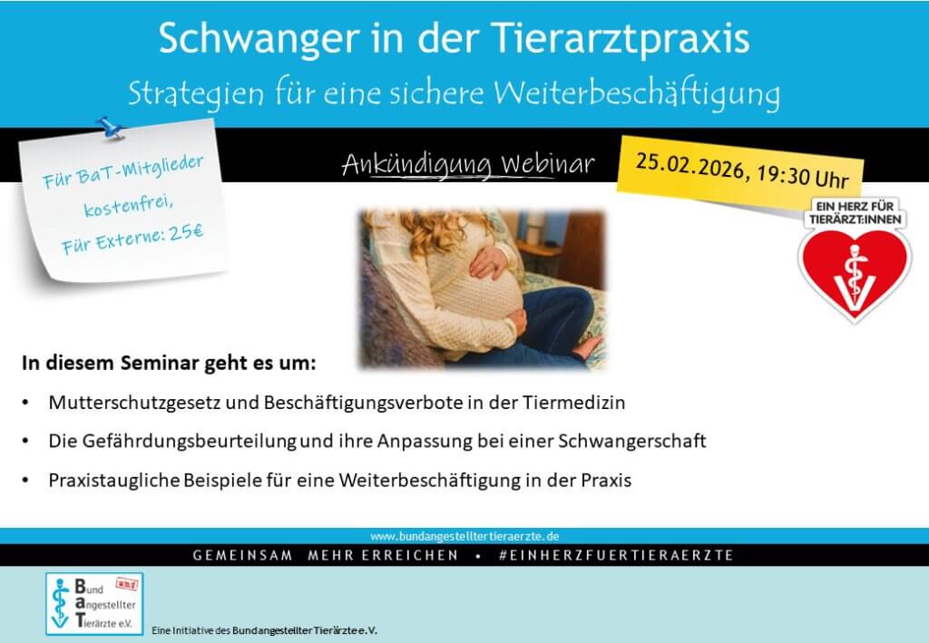 Am 25.02.2026 ab 19:30 Uhr geht es in unserem Online-Seminar “Schwanger in der Tierarztpraxis — Strategien für eine sichere Weiterbeschäftigung” rund um die Schwangerschaft als Tierärztin.